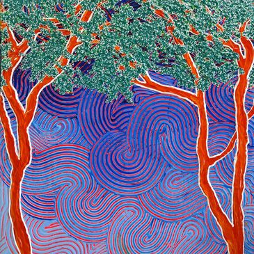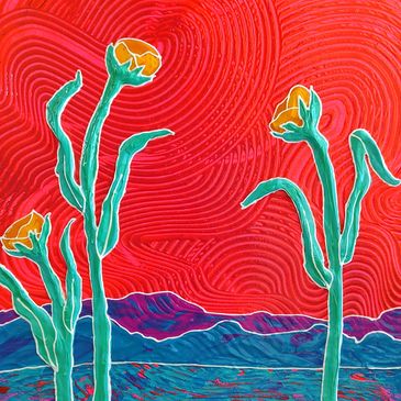 Katie creates colorful, acrylic works of art on canvas. She uses thick palette knife and brush strokes to give each artwork thick texture. She works on landscape and botanical imagery with texture and bold color. Her work embodies a joyful spirit and shares her love of color and nature.
